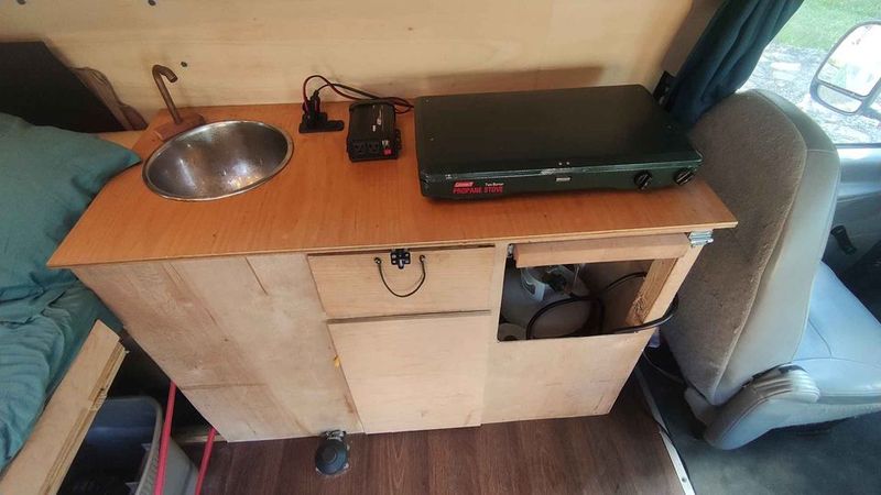 - Lots of equipements sold with the van : blanket, propane heater, dishes, portable toilets, tank and hand-pump for drinkable water, cleaning tools, standard tools for maintenance (screwdrivers, etc.), USB fan, DC chargers, bluetooth tape for music, etc.