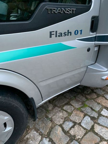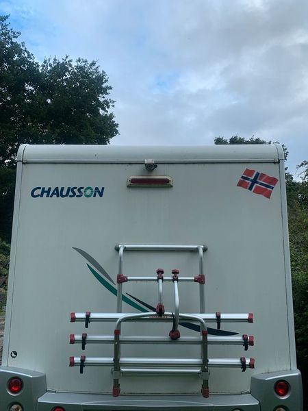 Atrás da autocaravana existe um parque de bicicletas para três bicicletas.